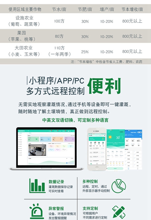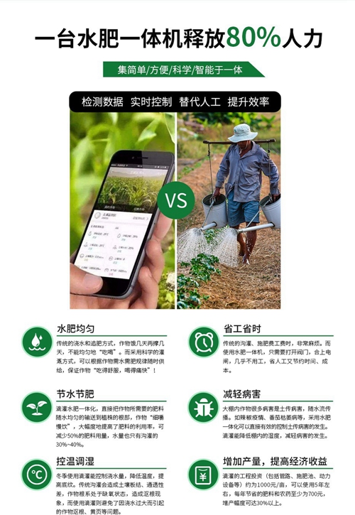 自動灌溉:可依據(jù)設(shè)定的灌溉施肥程序自動執(zhí)行輪灌任務(wù),無需人工操作,定時定量進(jìn)行灌溉和施肥。