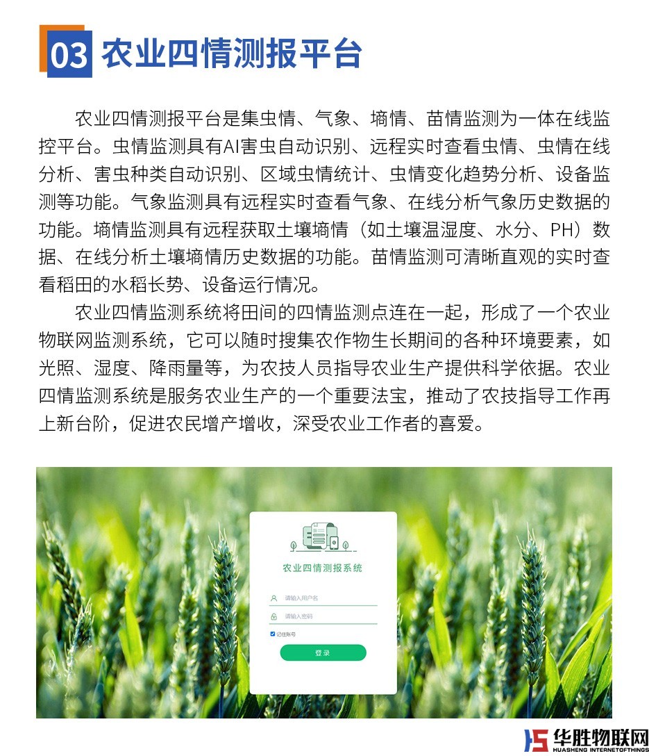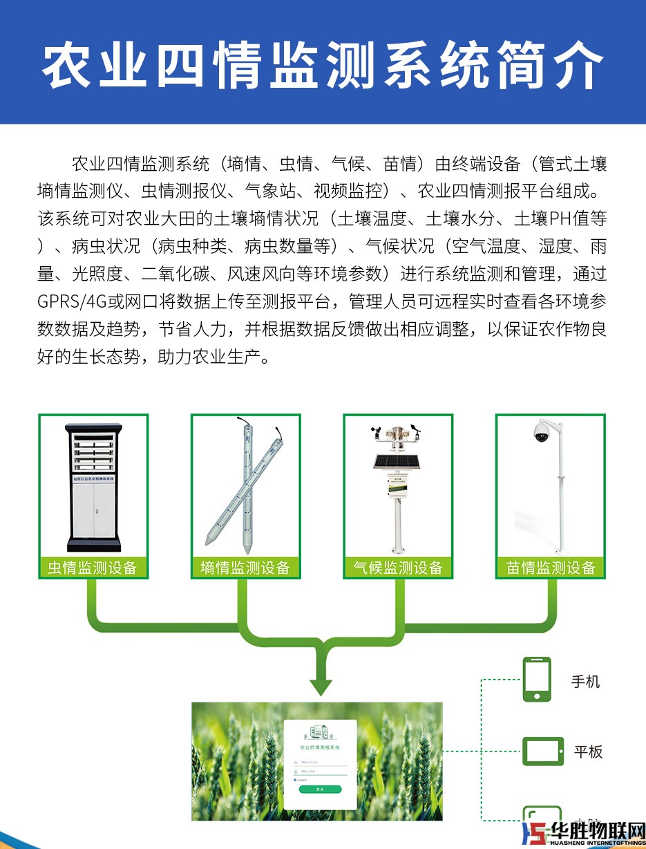 農(nóng)業(yè)四情監(jiān)測(cè)系統(tǒng)(墑情、蟲(chóng)情、氣候、苗情)由終端設(shè)備(管式土壤墑情監(jiān)測(cè)儀、蟲(chóng)情測(cè)報(bào)儀、氣象站、視頻監(jiān)控)、農(nóng)業(yè)四情測(cè)報(bào)平臺(tái)組成。該系統(tǒng)可對(duì)農(nóng)業(yè)大田的土壤墑情狀況(土壤溫度、土壤水分、土壤PH值等)、